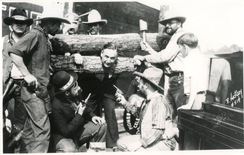 Group of men dressed up for the Centralia Pioneer Days, Centralia, WA ca. 1933. Shows men putting a man without a beard in a stockade. If one did not grow a beard, he was fined or put in the stockade. Have negative.Collection