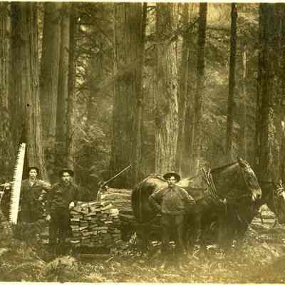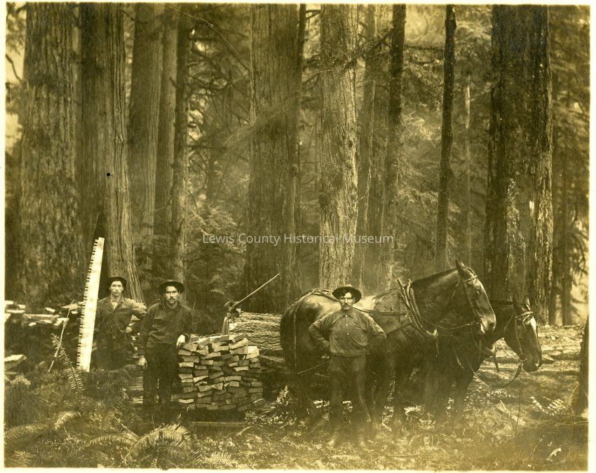 Centralia, WA logging scene ca. 1907. No ID on the three men with team of horses. A pile of what appears to be split shake bolts or split wood of either fir or cedar.