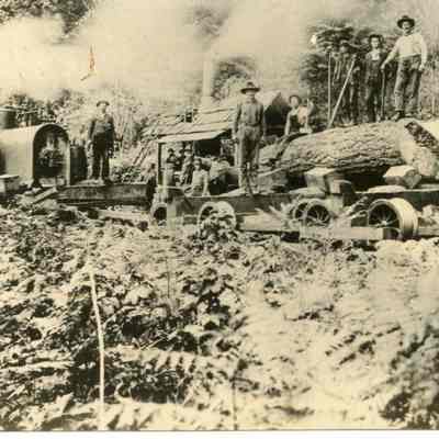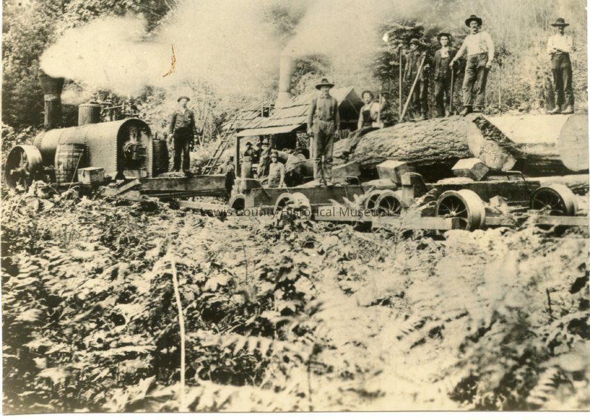 No ID on early logging scene. Photo donated by W. I. Rector of Rt. 3, Centralia, Wa. Possibly Hanaford or Salzer Valley.