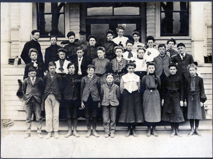 Unidentified Chehalis Class. Bearded teacher stands in back of students who appear to be 8th Graders, possible graduates as several girls are wearing corsages. circa 1910Collection
