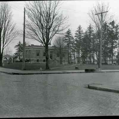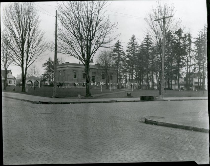 Carnegie Library in George Washington Park, Centralia, WA. The turret atop the Centralia Hotel shows over the Library roofline. Two old houses show on Main St. as well as the present Campbell Auto Co. building (present owner). Photo 1918-20.Collection