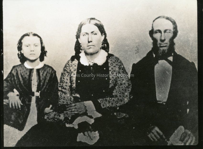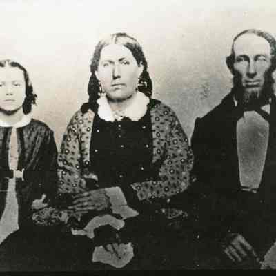Family portrait of Dr. James H. Roundtree, wife Emeline Cole (Riddle) Roundtree and child Julian Jane, circa 1855-60. These were parents of Mary Adeline Borst. Have negative.