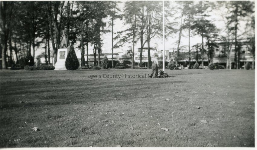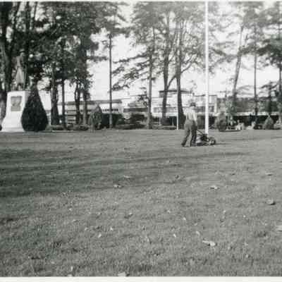 Mr. Merrick, caretaker, mowing the lawn in City Park Oct. 28, 1939, Centralia, WA.