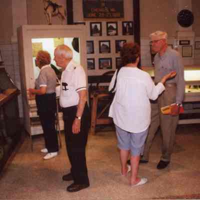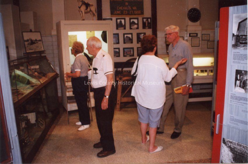 No ID on three people to the left, Ed Smethers on right, at Smithsonian exhibit at the Lewis County Historical Museum, July 13, 2001.