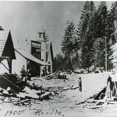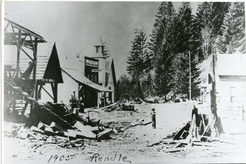 Excellent view of some of the buildings in Randle, WA ca. 1910. There has been a fire and the Matt Randle General Merchandise Store, which was the Hotel and Post Office, as well is shown. Church is in the background, unidentified boy in center.Collection