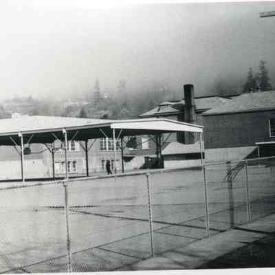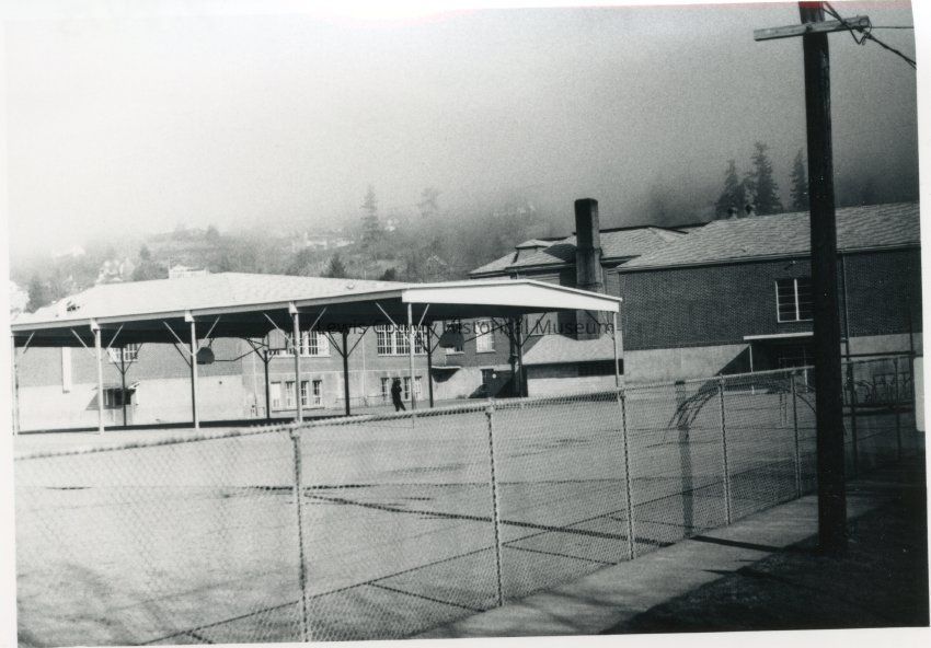 Photo of the playground at Cascade School, 1971. Play shed and the back of the School building is seen. Taken from 3rd Street looking Northeast. Chehalis, WA. Have negative.Collection