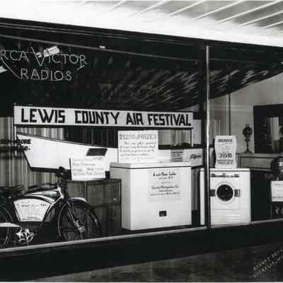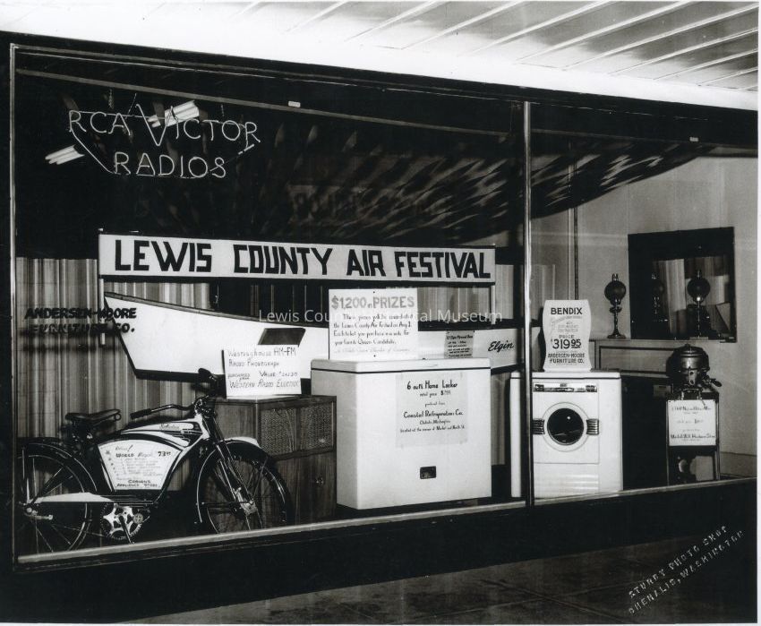 Andersen - Moore Furniture Co. Front window advertising the Lewis County Air Festival 1950-1951. Address was 316/318/320 North Tower, Centralia, WACollection