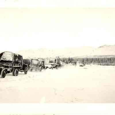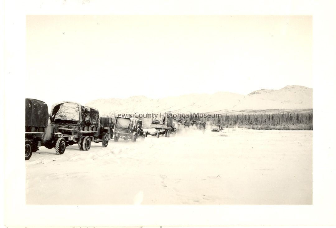 Winter of 1942. Convoy of E Company, 18th engineers. Leaving job on Alcan Highway on way to Whitehorse, Yukon Territory for the coming Aleutian campaign on Attu Island and building of the Shemya Airbase.Collection