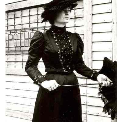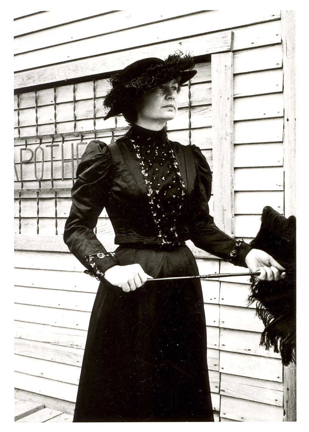 Sharon Hagstrom in a 1900's black silk evening dress with gold sequins at Old Town, SWW Fairgrounds. Taken for Fashion Thru The Ages, 1980. Have Negative.Collection