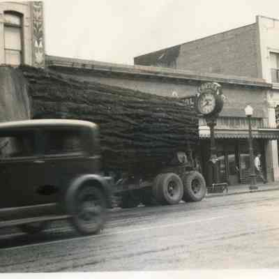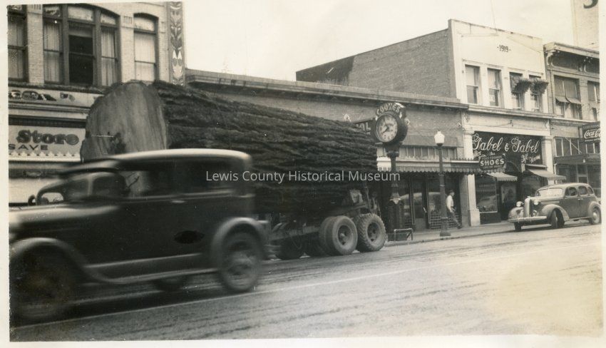 Market Street, Chehalis, WA, scene of store fronts: Cooke's Jewelry Store, Gabel and Gabel Stationary Store, a huge log cut near Harmony on a truck parked. ca. 1939.Collection
