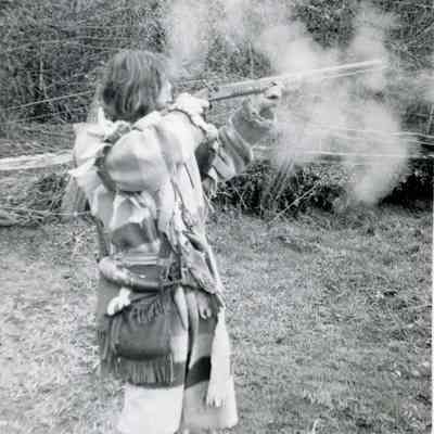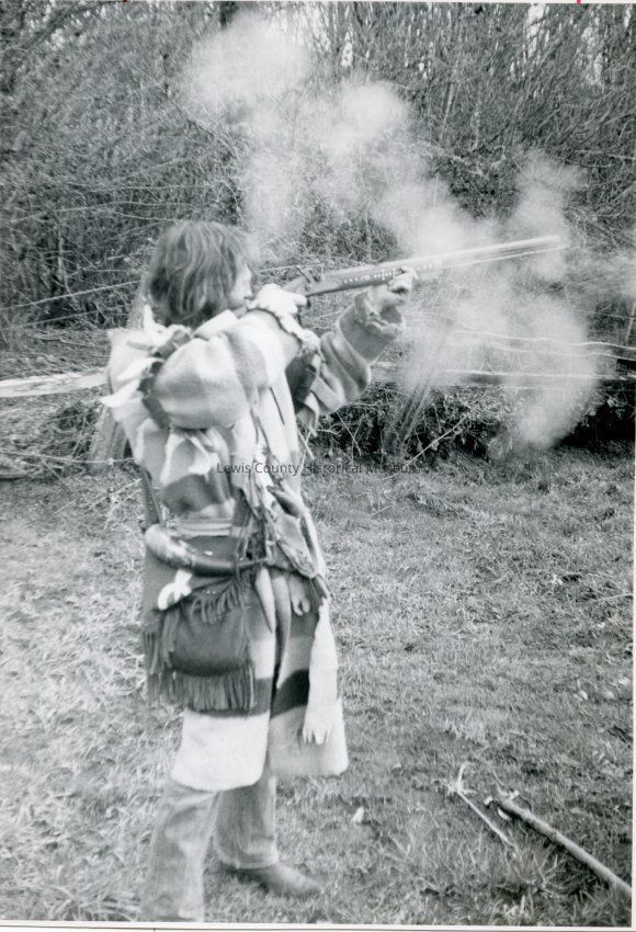 Greg Lamping dressed in mountain man clothes and shooting a black powder rifle in Randle, WA 1982. Set of 5 related photos P7996 - P8000 Daily Chronicle Photo