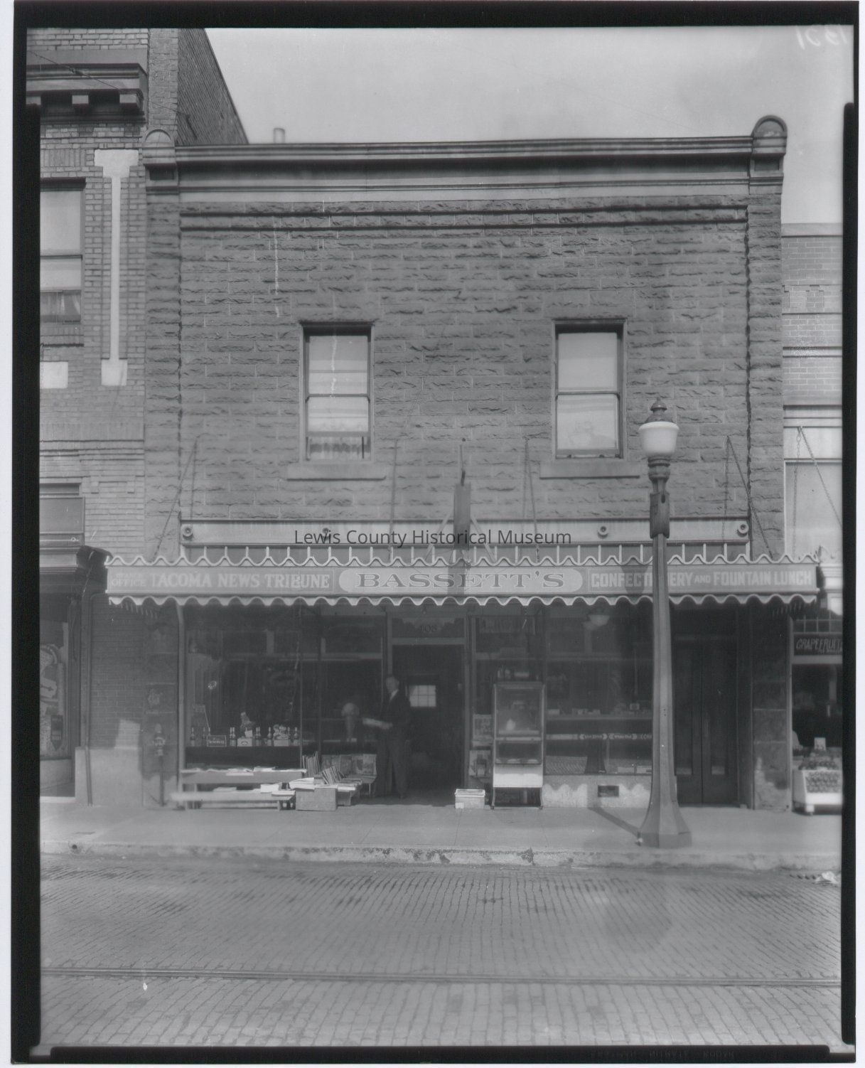 Bassett's Confectionary, Cigars and Tobacco, 216A N. Tower, Centralia, owned and operated by Wm. and Edith Bassett in 1920s. In 1930s was located at 408 N. Tower. 8x10, black and white, Dressler Collection.Collection