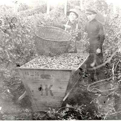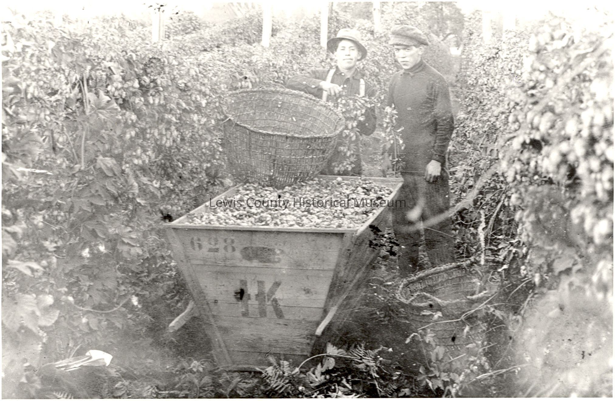 Hop picking photo of two boys in a field with a basket and wooden bin. Good photo of hop vines, hops and equipment. Boy on the right is Murphy Secena and the boy on the left is Albert Roundtree. Have negative.Collection