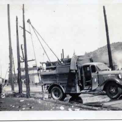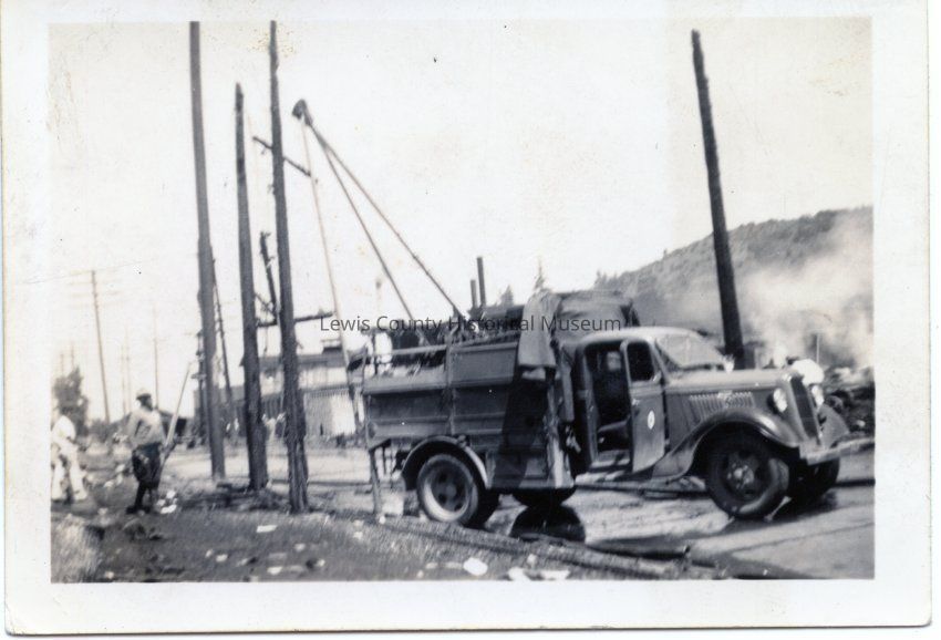 Photo of truck in front of remains of Palmer Lumber Co., Chehalis, WA after fire in 1939
