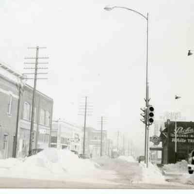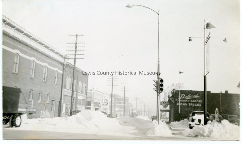 Snowstorm January 13, 1950, looking north on Pearl from Main Steet. Stores on left are Reda Hardware, ____, Pioneer Feed and Seed. On right is Jack Osborne Mobil Gas Station, Osborne's Packard Dealership. Lewis and Clark Hotel sign visible on right in the distance.