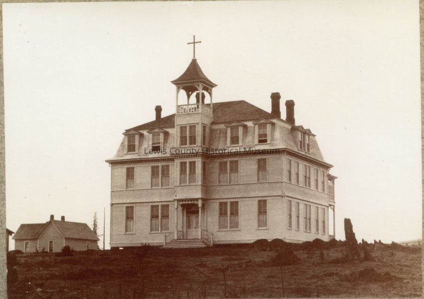 Holy Rosary Academy, built 1893, facing St. Helens Ave., Chehalis, WA. It was the educational center for Catholic students until 1923 when the St. Joseph School opened on 6th St. Photo 1900.