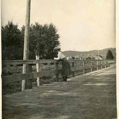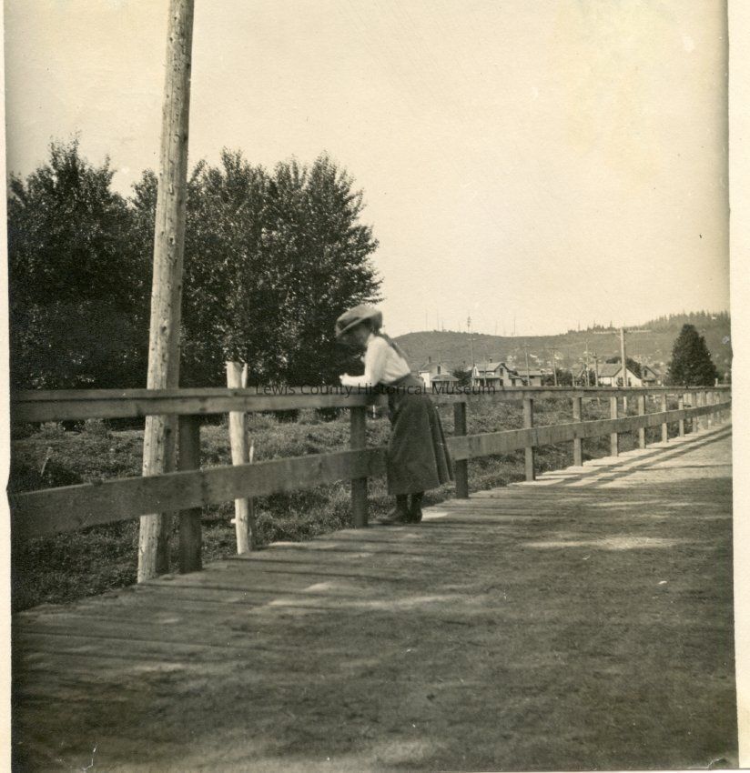 Looking east from Riverside Street at Chehalis, WA. Logged off hill in background. ca. 1910Collection