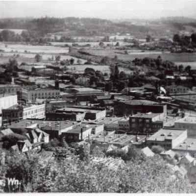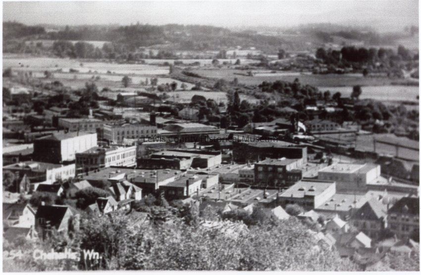 Bird's eye view of Chehalis, WA. Taken from the Chehalis hillside looking to the Chehalis RR Depot in the lower right corner. Building in that corner is the old St. Helens Hotel after it had been moved from its original location on Market St. Have negative.