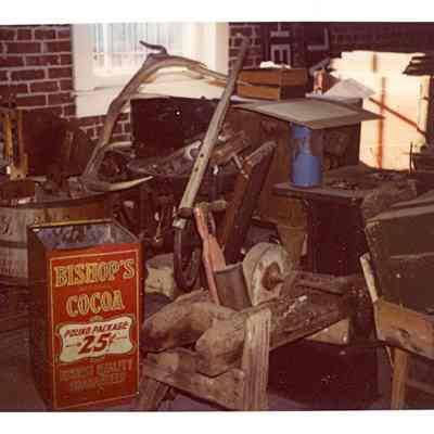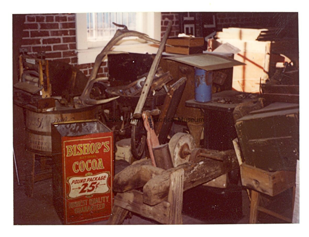Storage room disarray after the move from the Cory Home to the Depot,1978. Shows farm tools and washing machine in the storage area. Have Slide