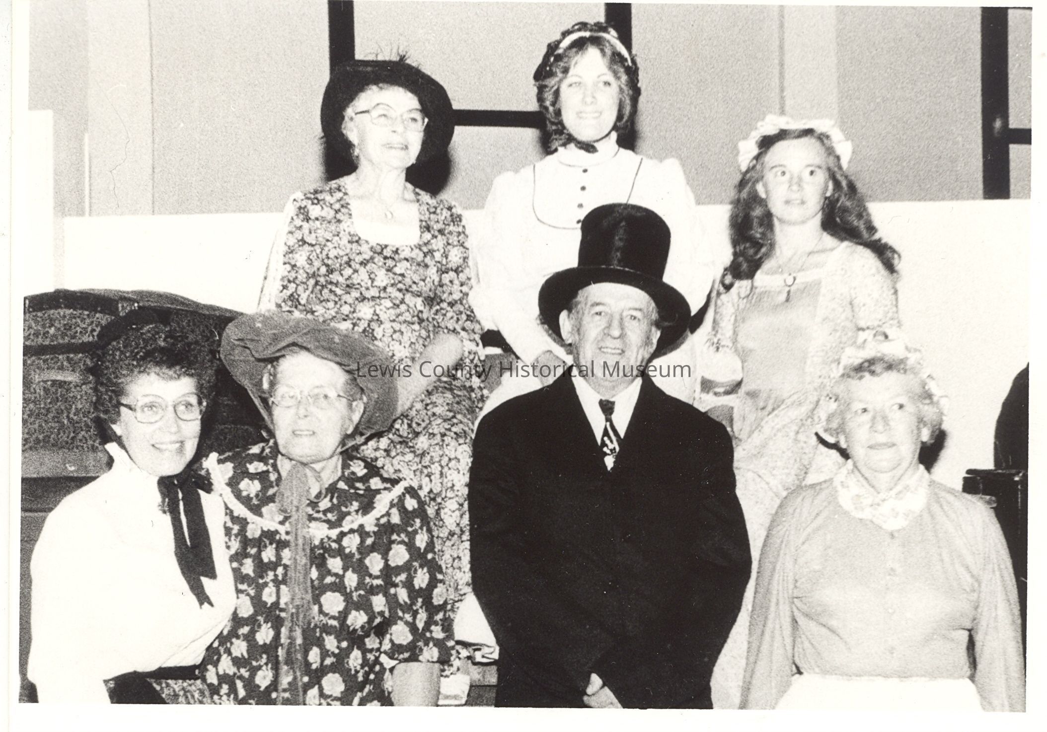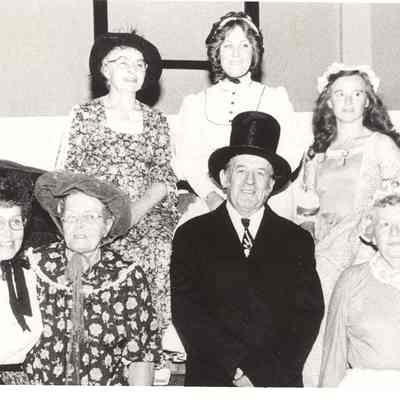 Lewis County Historical Museum grand opening, Chehalis Depot, September 18,1979. Hosting group, posed on baggage cart of trunks. ID top L toR: Margaret Shields (Genealogy Chairman), Jill Kangas (Museum director), Loretta Jones (Oral history transcriber) Bottom L to R: Myrt Bunker (staff aide), Julia Miller (Society Treasurer), Jim Backman (Society President), Violet Snyder (Chehalis businesswoman). Have Slides.