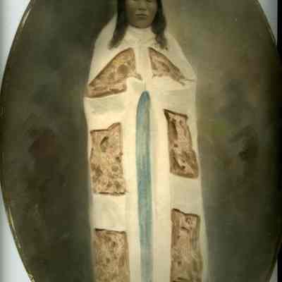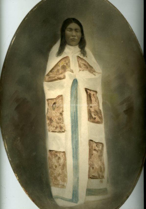 John Ike portrait. He is in native robe. Born in 1870, lived in Winlock at death. Oval frame.