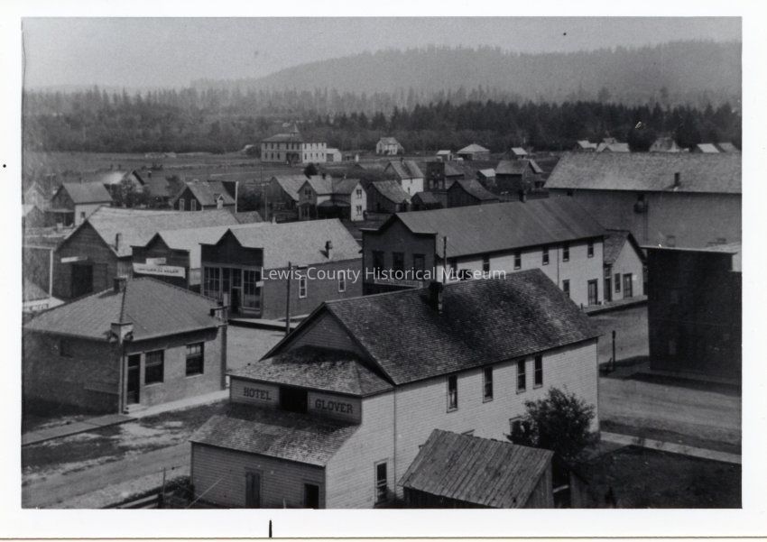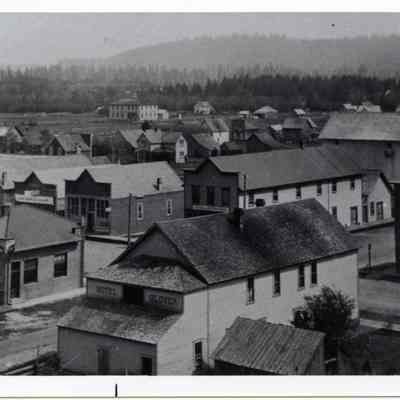 Photo of early Oakville at corner of Pine St. and State St. The Hotel Glover in foreground was operated by Thomas G. Glover (1852-1935) and his wife Elizabeth M. Swain Glover (1855-1939) who came to Oakville about 1889. The building in 1986 is the only tavern. Left is Oakville State Bank, current Security State Bank. Across the street is building now known as the Liverty Market (previous Miller's Store). Building on left was the old Post Office, now an antique shop. In back is the Oakville Grange Hall, previous was Oakville Grade School. ca. 1890's Have negative. Have slide.Collection