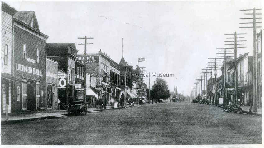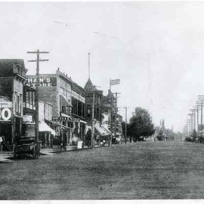 Photo looking down Market Street circa late 1800's with dirt streets. Businesses are: Vaughn Livery and Feed Stables, Chehalis Hotel, C. D. Welton Bicycle Shop, Boots and Shoe Shop, Millinery Shop, Gem Drug Store and an unidentified Bakery. At the center left of the picture is part of the St. Helens Hotel. Have negative.Collection