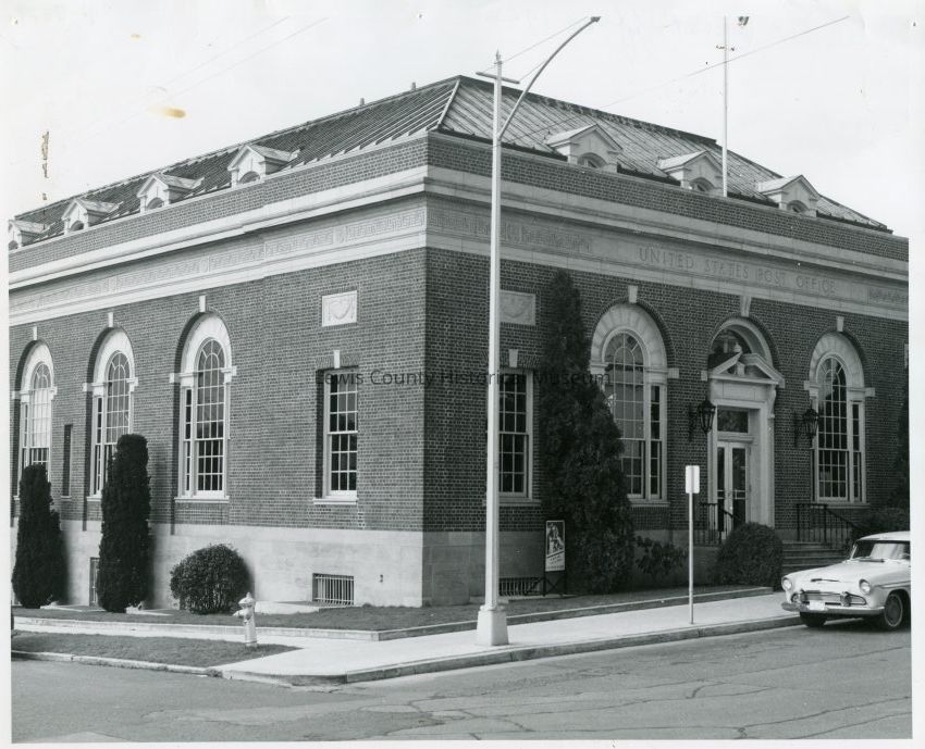 Exterior photo of the Chehalis, WA Post Office on Cascade Avenue, a brick structure built about 1934. This picture was taken about 1950's.Collection