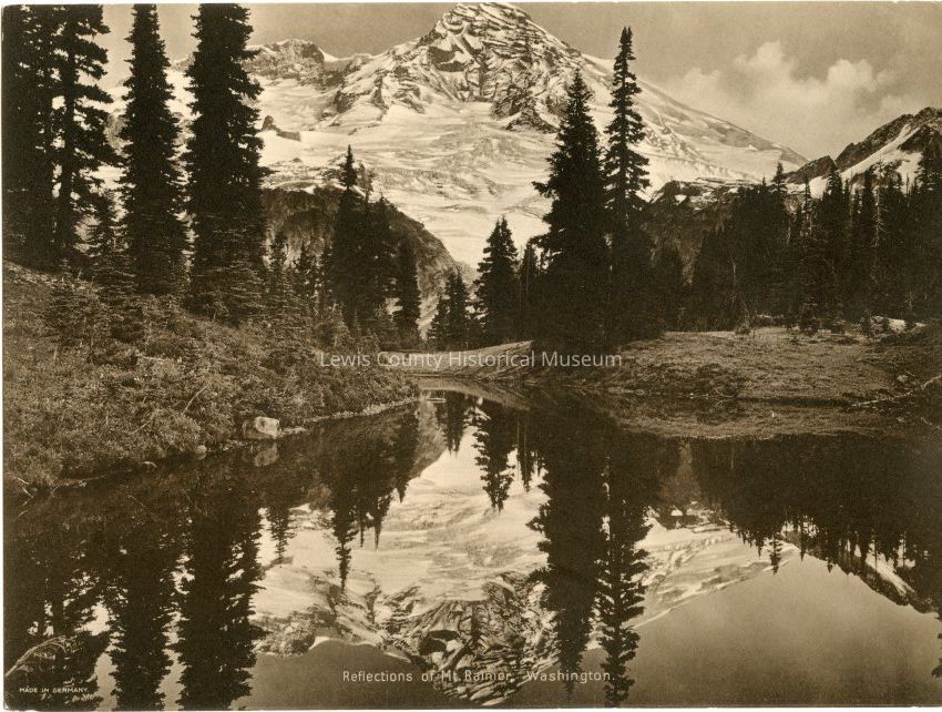 Picture showing the reflection of Mt. Rainier in a lake, Washington. Lake was on top of Indian Henry Ridge.