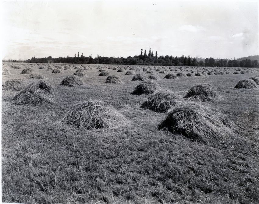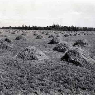 Harvesting photo showing a hay field with the hay cut and stacked in piles, ready to be loaded on wagons. circa 1930'sCollection