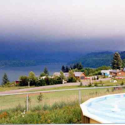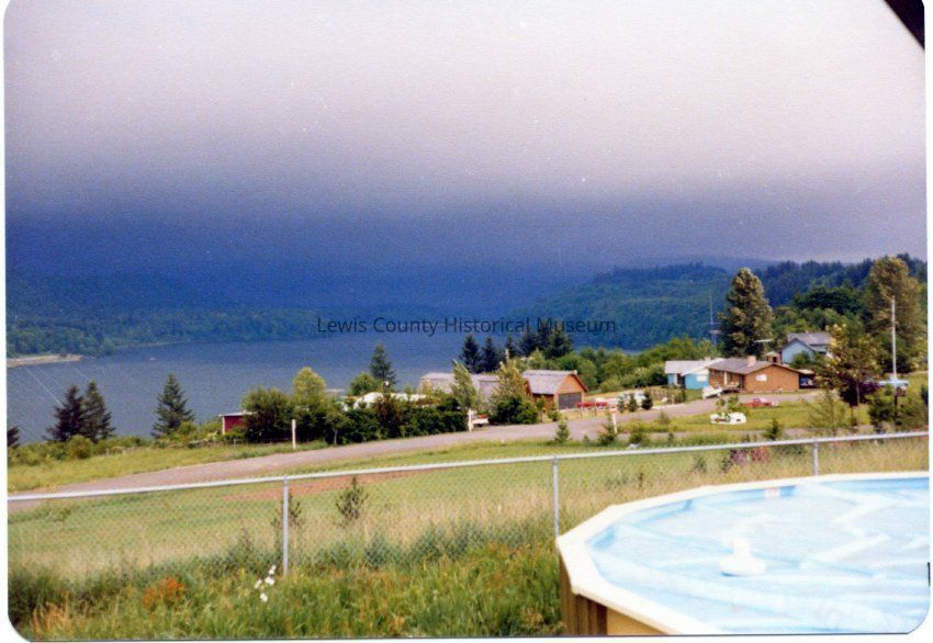 Color photo of Mt. St. Helen's exploding May 18, 1980. Taken by Tom Brooks, Cinebar, WA. Exposure #17 shows ash cloud descending over Mayfield Lake.Lexicon