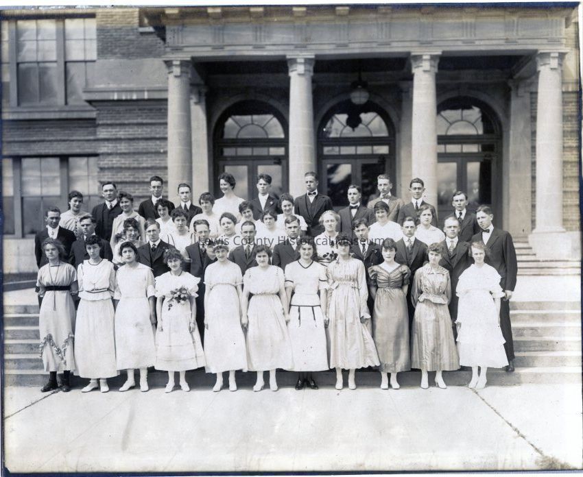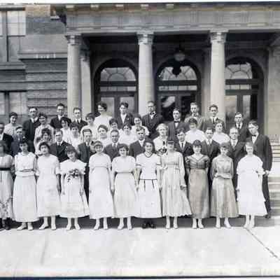 Centralia High School graduating class of June 5, 1916. Students standing on exterior steps. ID: Edith L. Airron, Grace N. Arveson, Gladys E. Black, Irma V. Boatman, Earl E. Brown, Marie Christensen, Dorothy M. Clawson, Albert B. Cobb, Katherine E. Courter, Roy D. Davidson, Charles H. Eaton, Mary H. Eaton, Mary E. Everett, Ernest S. Farrell, Effie M. Fitzgerald, Myrtle M. Foron, George L. Hahn, Verle Hanna, Neva Harris, Day Hilborn, Grant Hodge, Ruth Hoss, Elmer G. Johnson, Francis Keefe, Ella M. Lammer, Margaret A, Lyness, Henry C. Madsen, Marcus O'Day, Edith Parks, George Rardin, Olivene Rhines, Aletta Rowswell, Walter Ruble, George Schacht, Ruth Schorer, Pauline Schulter, John Schummer, Ralph Smith, Boyd Thacker, Nellie Watson, Hazel Weaver, John Wheeler, George White, Camilla Williams and Blanche Workman.