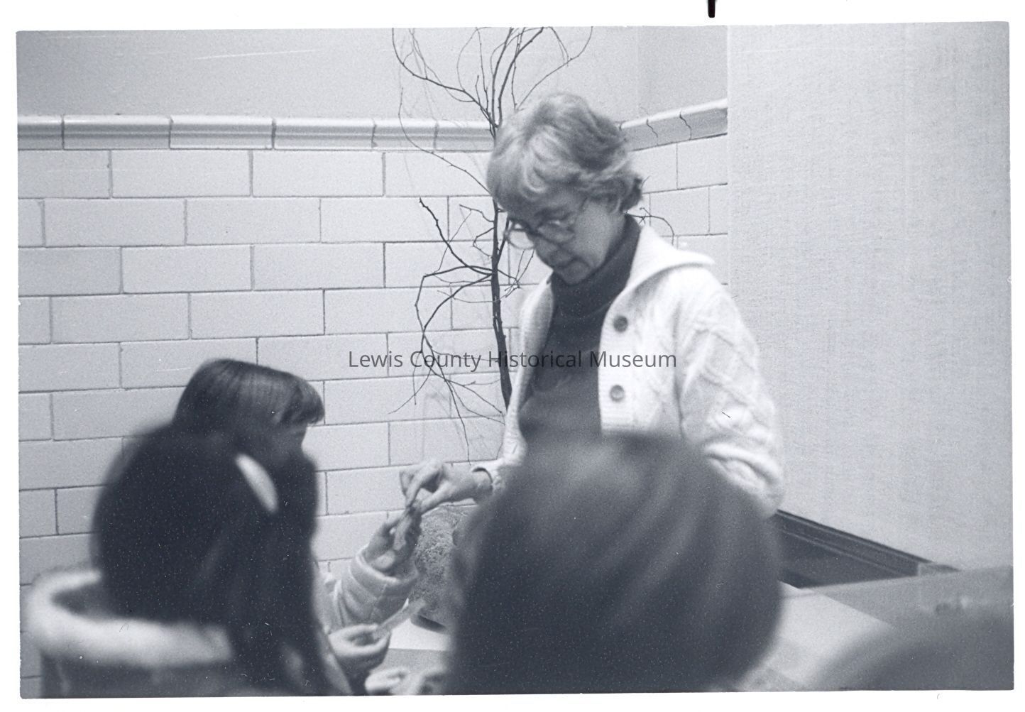 Mary Jane Sheridan showing Chehalis Indian Artifacts to a 3rd grade tour group at the Museum, Dec. 1979 Have negative.Lexicon