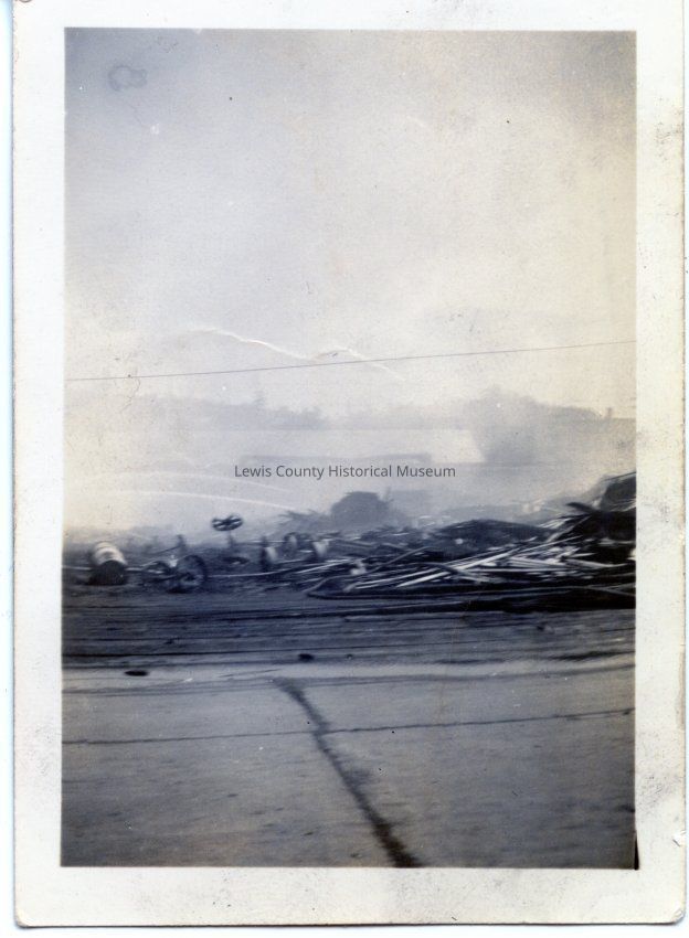 Photo of remains of Palmer Lumber Co., Chehalis after fire in 1939.