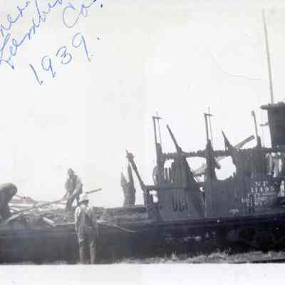 Photo of the remains of Railroad car at Palmer Lumber Co., Chehalis, WA after fire in 1939.