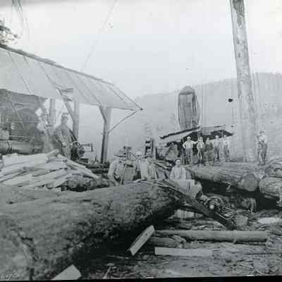 Mill workers of Mason County Logging Co. Gin pole in background. Felled tree on railroad car. Steam donkey in operation. Have slide.
