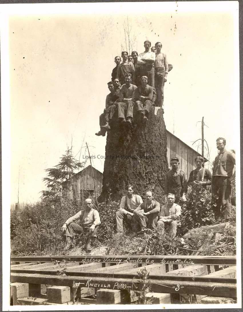 Salzer Valley Lumber Co. Centralia, Wa. Kneisel photo. Railroad tracks in foreground, 7 men sitting and standing around a tree stump, 11 men standing on same tree stump. Many of the workers had no shirts on, just long sleeved underware and overalls. Frame buildings in the background. Have negative.Collection