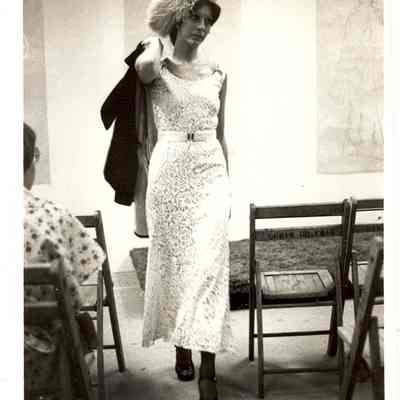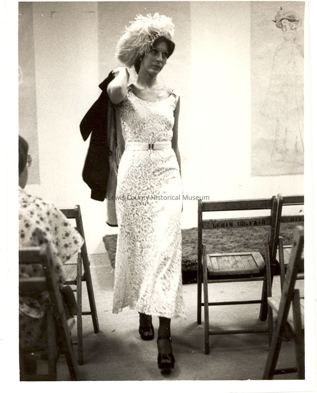 Fashion thru the Ages fashion show May 1977. Model Polly Outlaw is wearing ankle length, sleeveless knit belted shift, ostrich feather hat, brown velveteen jacket with bloused sleeves.Lexicon