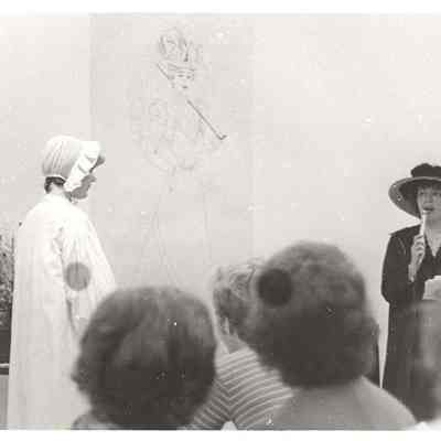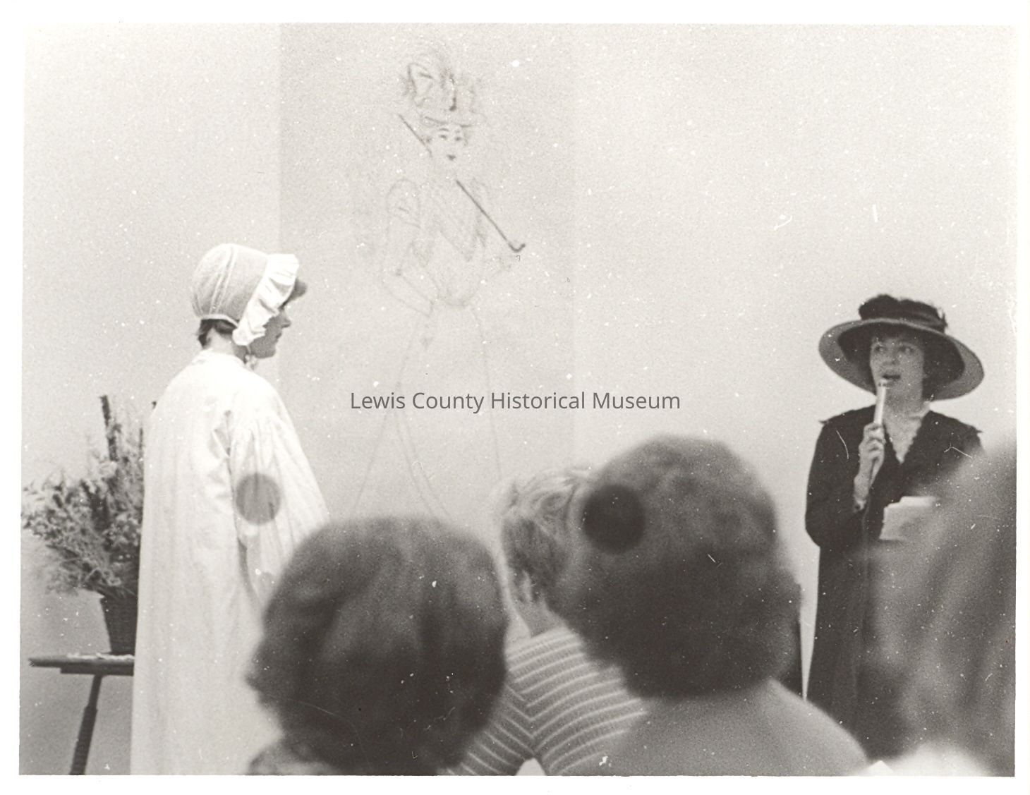 "Fashion Thru The Ages" MC, Miki McDonald in a 1910 coat and hat, Bobbie Hanna in a white nightgown and bonnet. Shows audience. Lewis County Mall. July 1977.Lexicon