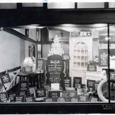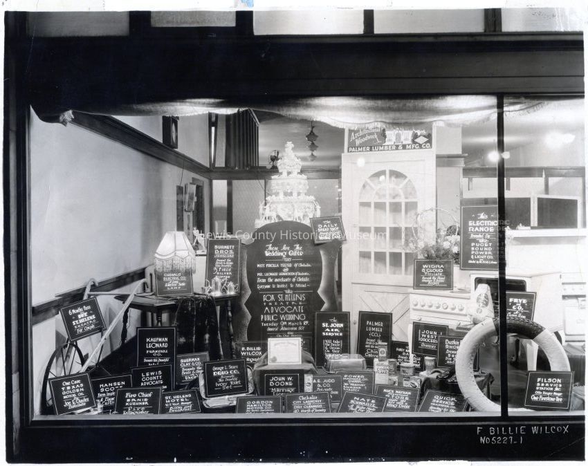 Store window displaying gifts from Chehalis Merchants to be given to Pricilla Teeter of Chehalis and Leonard Henrickson of Onalaska, WA for their wedding at the Fox St. Helens Theatre on March 18, 1930, open to the public.Collection