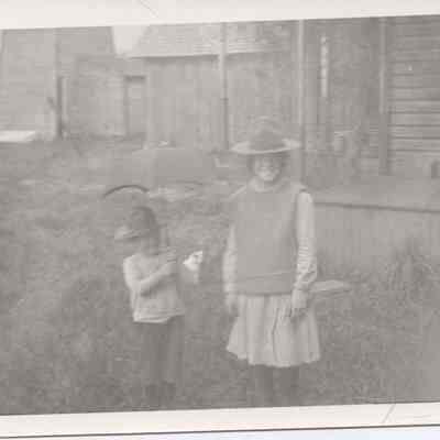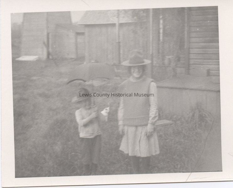 Loris Sweany (Sweeney), 7-8 years old and brother Gordon Sweany, about 4 or 5 years old, wearing WWI Army hats, ca. 1917-18. Black and white, dim photo, Burke collection, 03.22.Collection