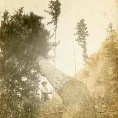 Abe and Joe Garrison falling a tree from their spring board positions, at Centralia. (See P20499). b&w 2011.45Lexicon