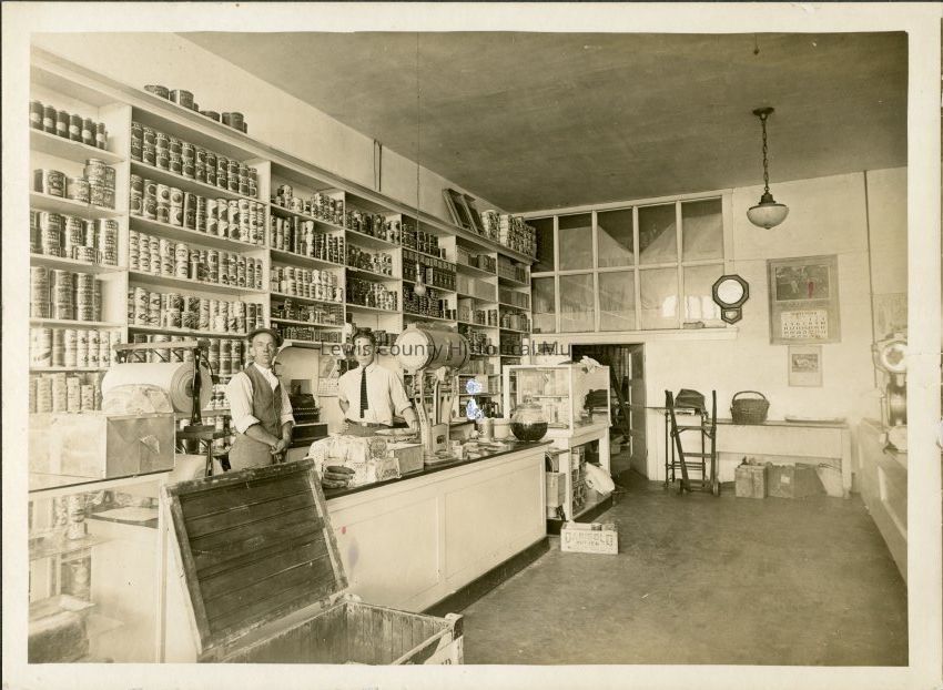Hallie Knapp on right, working at J. H. Walter Meat Shop, in the 1920's. All the Knapps took jobs in the meat cutting business. No ID on other man. Note the meager stock of canned merchandise on shelves.Collection