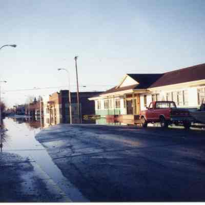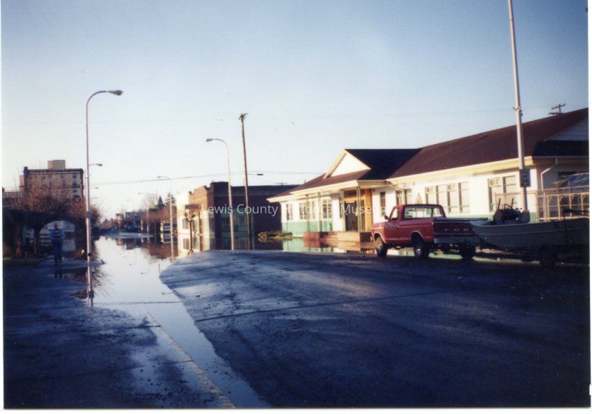 Looking south from near 500 block of N. Pearl, Centralia, WA, during Feb. 1996 flood; Weyerhaueser Bldg. on right.Collection