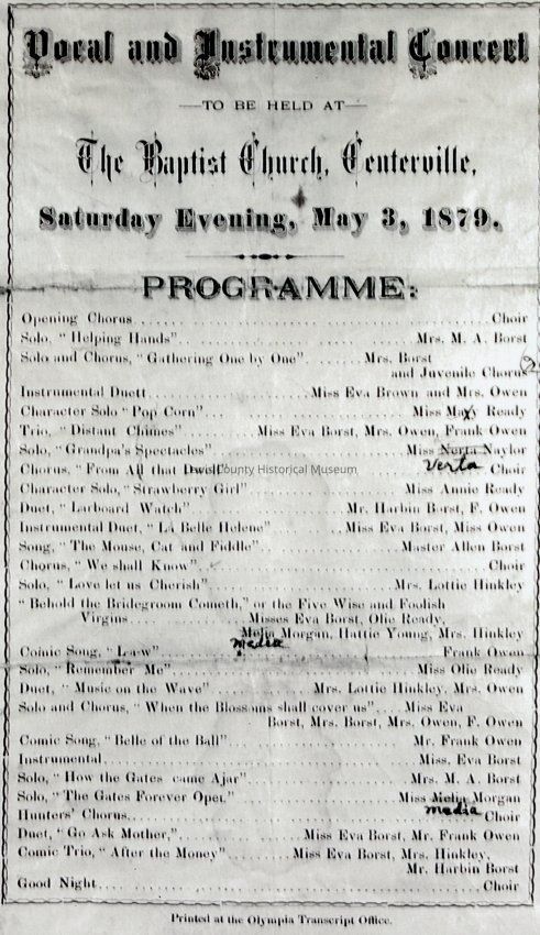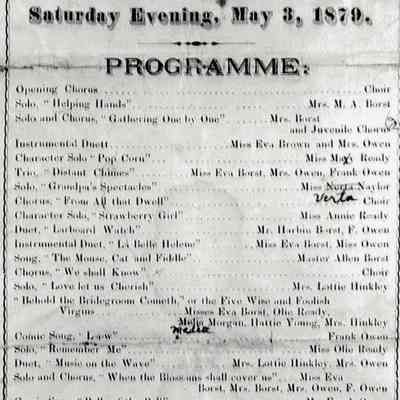 Program printed for Vocal and Instrumental Concert, at the Baptist Church in Centerville, Saturday evening, May 3, 1879. Have negative.Collection