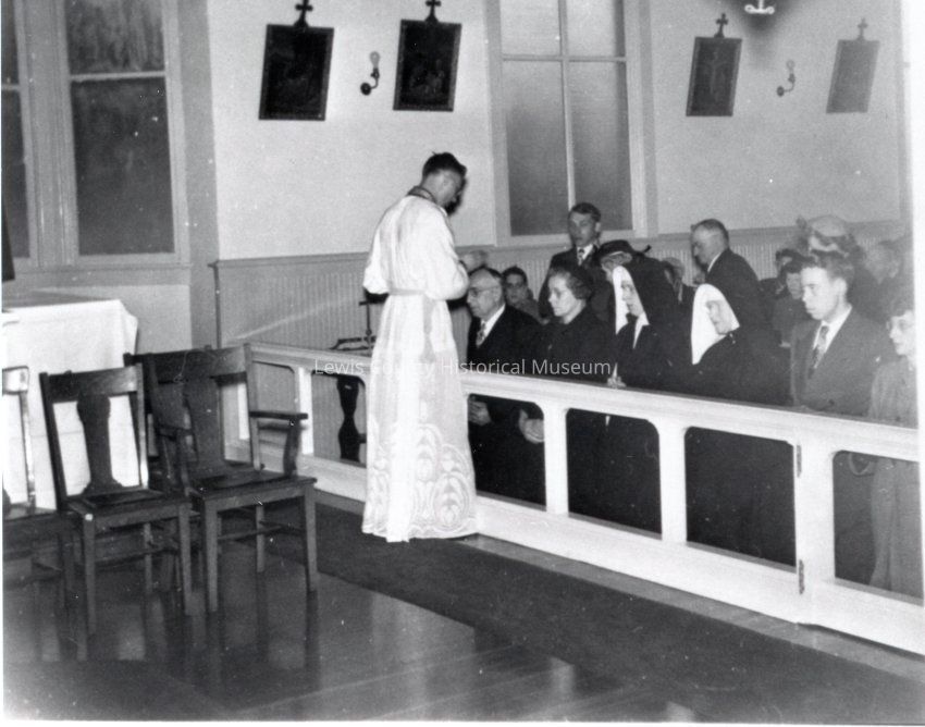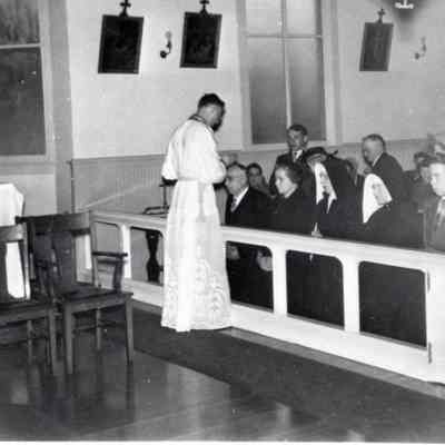 From book project of History of Centralia Saint Mary's Catholic Church, 1910-86. This photo shows Rev. John Rice's 1st Mass, 3/26/1950 distribution of Communion. Have negative.