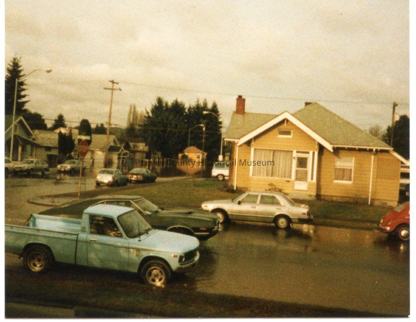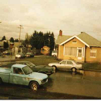 January 1990 Flood. China Creek overflowed onto Yew St., Centralia, WA.