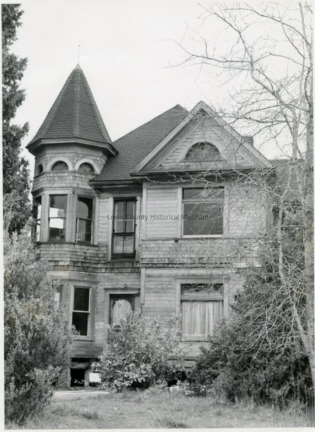 A 1980 photo of the exterior of the old Ben Olson house built in 1903. Located at the end of D Street in Vader, WA. The house is in need of repair and has trees all around it. After restoration view is P7522. Have slide.