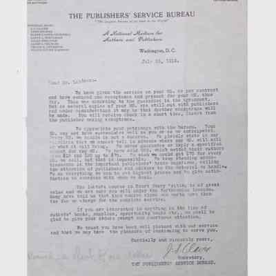 Dated July 23, 1919, this letter from The Publishers' Service Bureau in Washington, D.C., addresses Latimer regarding his manuscript submission.Collection