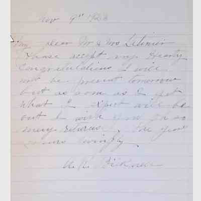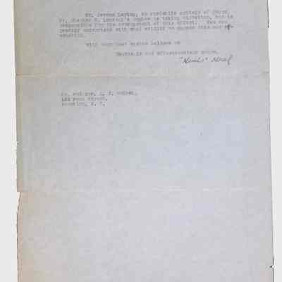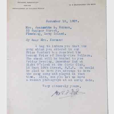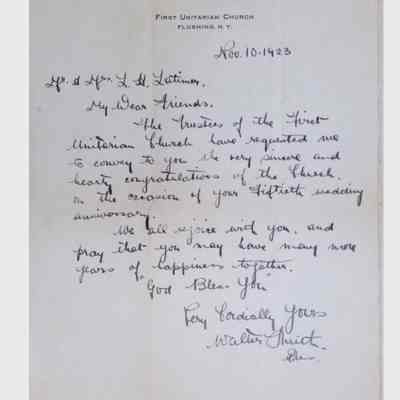 This folder contains a miscellaneous assortment of letters addressed to Lewis H. Latimer, including congratulations to Lewis and Mary Latimer on their Golden wedding anniversary (1923) and “regrets” from invited guests who could not attend their anniversary party, an extended family reminiscence by Lewis Latimer’s nephew Cornelius McKeel (also called “Neal”) at the time of the Latimers’ anniversary, a letter to Lewis Latimer’s daughter Jeannette Norman from W.E.B. DuBois informing her that a song she wrote has been awarded Second Prize in a contest held by The Crisis magazine (1927), and a letter from William H. Meadowcroft, Thomas Edison’s secretary, to Lewis Latimer (1921).Context